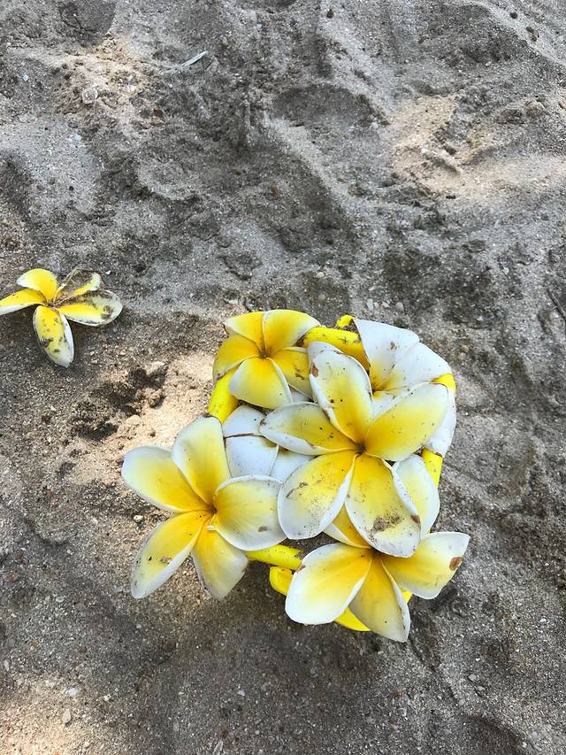 走向海滩的道路上,鸡蛋花洒落一地。