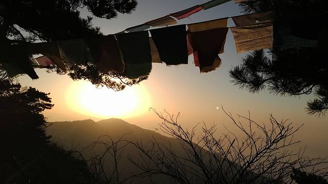 上了顶,太阳即将落山了,夕阳、群山、经幡