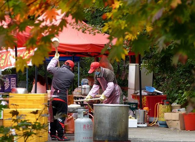 也许是老边沟独特的小气候,这里的枫叶明显的比外面红的早!图为景区的工作人员在打扫卫生。