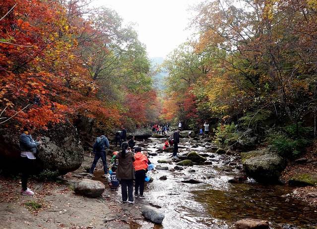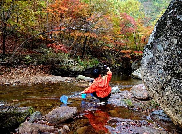 这缤纷如画的山水中,枫叶飞舞、遍地飘红、泉水叮咚,宛如世外桃源、人间仙境......