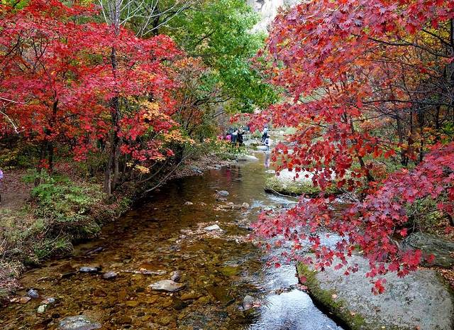 这是老边沟风景区入口附近的一条小河,有人踏着独木桥过河去摘枫叶。