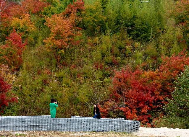 这两棵颜色不同的红枫,成为众多游人的合影地。