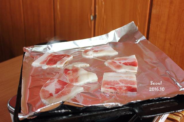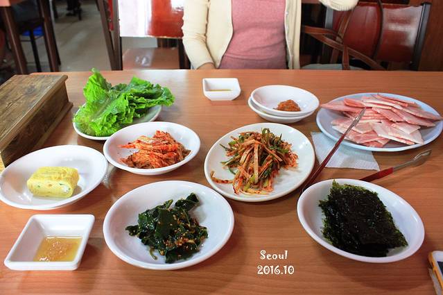 这家最大的特色就是把五花肉放在铺好了锡箔纸的铁板上烤,因为我喜欢烤得焦一点儿的,所以不知道什么时候底下的锡箔纸就糊了呃...以为这是要店里的大妈给换呢,结果并不是,好像要自己去拿新的然后换好,因为无法英语沟通我俩真是云里雾里的,因此被一个脾气暴躁的大妈训了,叽里咕噜说了一大堆我也没听懂。后来还是隔壁桌结完账的一对情侣看到了,觉得我们和大妈可能也没法沟通,那个姑娘就帮我们弄好了~简直是天使有木有!但并不是这家的大妈都很凶态度很差那种,结账时候的大妈就超级nice~脾气暴躁那位估计是最近家庭感情不和睦吧......