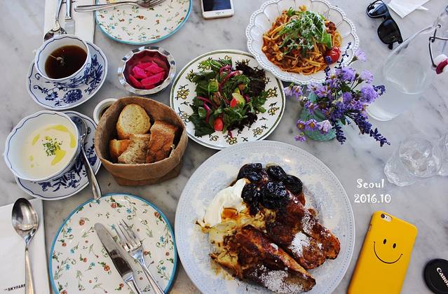 特别惊艳的竟然是他家的腌菜!还有有机沙拉,超级爽口~意面也不错~这个 toast 热乎乎的,包裹枫糖烤至外焦里嫩,撒上糖粉、冰淇淋和蜜枣,味道不错~就是量太大,吃多了会腻...<49000韩元>
