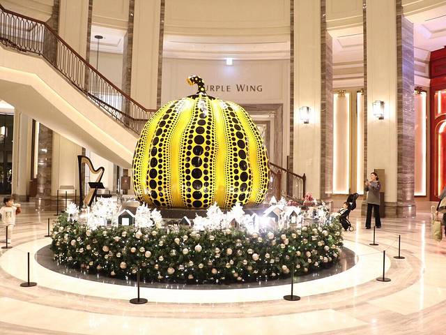冬天的百乐达斯城跟夏天感觉完全不一样,夏天的时候游客不是很多,而且开幕不久有点冷清,但是这次来,多了很多圣诞装饰和各种灯饰,显得很有生气; 从酒店外面开始就充满活力的感觉,也多了很多人来度假,大堂摆着很有名的日本国宝级的艺术家草间弥生的招牌黑圆点大南瓜,打卡必经之地!