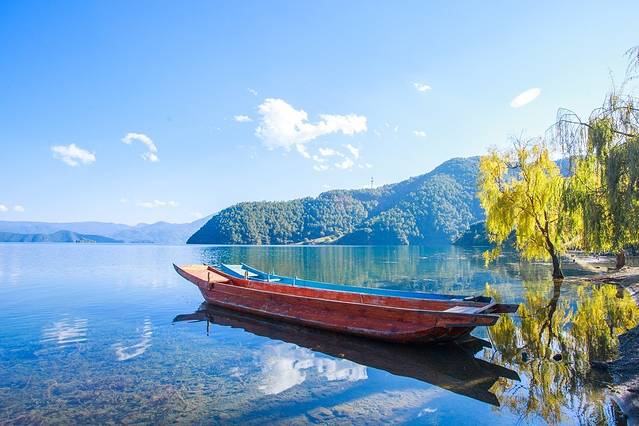 早起,沐浴泸沽湖的阳光,蓝天和白云在这里不需要碰运气