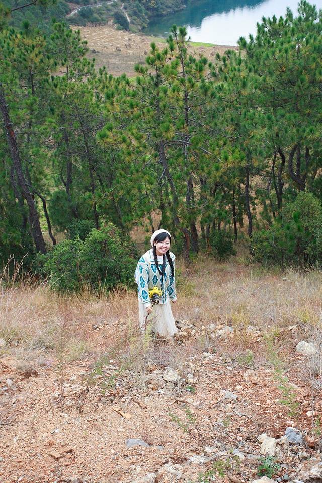 小伙伴穿的鞋子不大适合走山路,走在最后让我给她拍张照纪念一下。