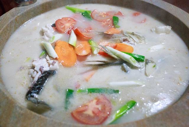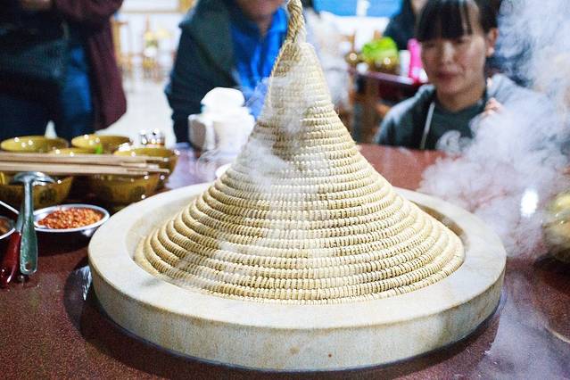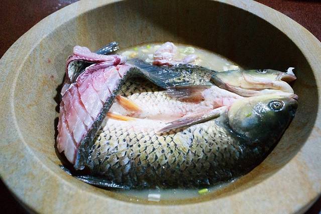 锅子是石头做的,胖头鱼用蒸汽蒸熟,吃之前光是看着这个蒸汽架势,就已经口水直流。