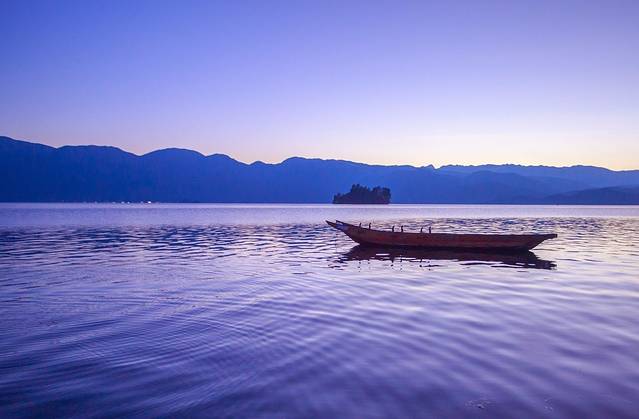 清晨的泸沽湖,湖水和天连成一片,蓝的醉人。