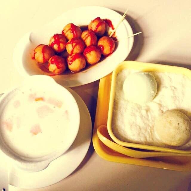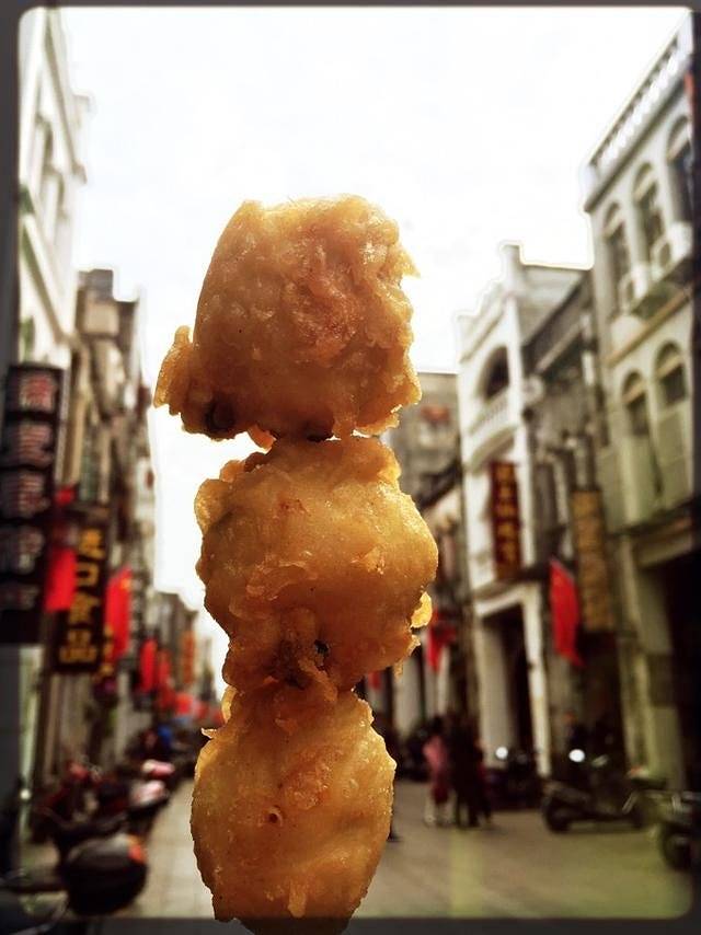 没错没错,这就是我心念很久的虾饼,一个饼爆满了虾子,一口咬下去大大的满足感,一点也不油。虾饼在老街很多家店都有卖,我吃过几家,感觉味道都差不多,生意最好的就是李姨虾饼。本来想吃宽记甜品的,结果他傲娇的还没开门,不过我还是要推荐他家的甜品,都很好吃,特别是杨枝甘露,一直是我念念不忘的(放一张我上次来吃的杨枝甘露和鱼丸,都好吃都好吃,下图右一就是杨枝甘露)