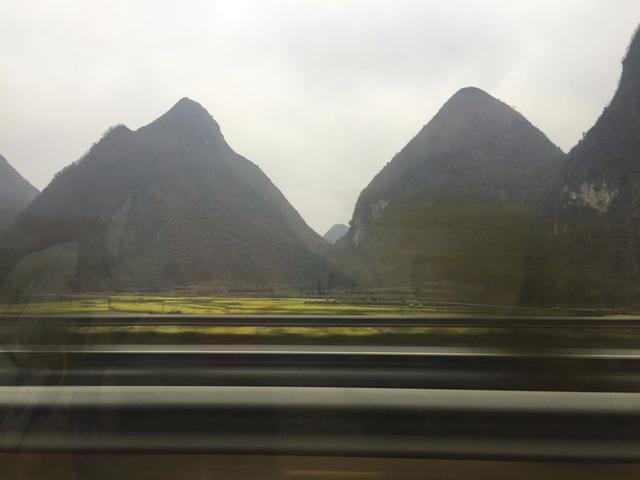 在向阳服务区休息后,我们继续出发前往今晚的落脚点——贵州都匀。一路上,两边的风景渐渐发生了变化,刚刚还连绵起伏的山峦此刻变成了一个个独立的山头,像什么呢?对,就像雨后春笋 ,才冒出了尖儿。梯田一环一环往上爬,偶尔还会遇见一大片正开的欢的油菜花。