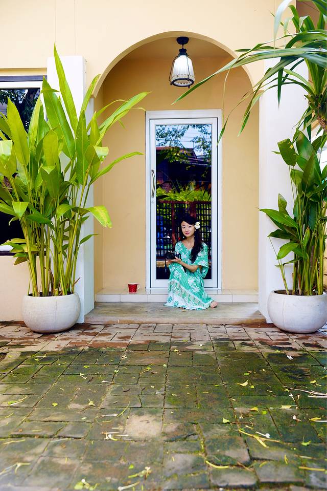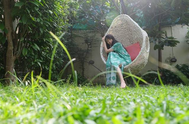 后花园花园草坪上藤编吊椅很有感觉,旁边鸡蛋花开了满树,拍照直接捡一朵当道具贼好看……