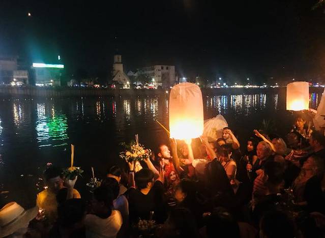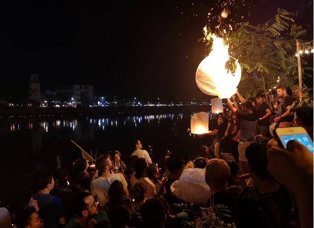 天灯节分了收费场和免费场。免费场就在古城河边,到了天灯节免费场一定能深刻体会到什么叫寸步难行。那人山人海场面比国内国庆节景区扎堆有过之无不及。