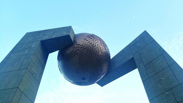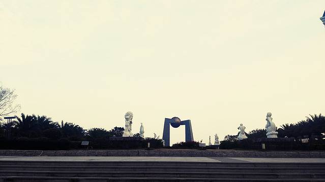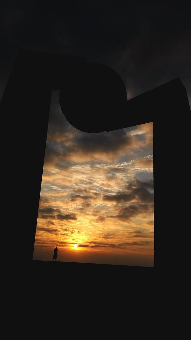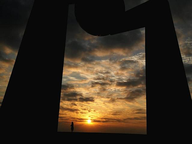 问了老板日出时间,第二天6点半起来跑到广场看日出。看着海面的那层黑云,以为是看不到日出了,时间已经过了6点50,日出的时间点,太阳还是没有露脸。不死心的继续等着,想着就等到它光芒万丈再走(黑云只是在海面那一片,天气很好)。过了一会,太阳向降落伞一般慢慢生气(当然,降落伞是往下落啦),红彤彤的,如婴儿一般纯洁,又像棒棒糖,很想咬上一口。相机坏了,只能用渣渣手机迫不及待的拍上几张照片,然后又跑到标志建筑物旁边拍,效果超满意,如果有相机就完美了~把照片给某人看时,又被鄙视了,说一看就是我拍的,这种照片不会有人专门浪费时间去网上下载的!!!