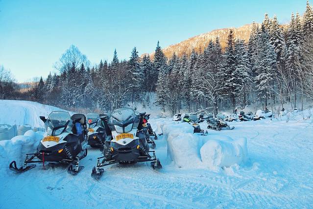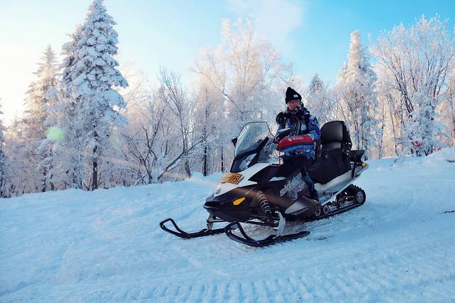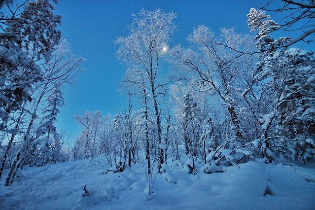 凌晨5点的时候我就已经整装待发拿着手电筒,向集合地走去,整个雪韵大街上只有我一个人走路的声响,该不会只有我一个人去看日出吧。谁知到了大石碑的集合地,已经有一些人群了,5点半准时出发前往大秃顶山啦!山脚下乘坐雪地摩托去往黑龙江的第一高峰大秃顶山(主峰1690米)观云海,赏雾凇,想想都是很激动的,本想着这么刺激的雪地摩托上下山的时候可以用手机拍个视频记录下,司机说你放弃这个念头吧,上下山还是手抓稳、两腿夹着车,注意安全,因为路很颠簸,每次跨越一个小山坡的时候,感觉雪地摩托是离开地面飞出去的,这个时候只怪自己没有带自己的go pro,只能放弃,天微微亮,有点泛蓝,坐着雪地摩托穿越在林海中,有种童话世界里,驯鹿穿越树林载我回家的感觉。