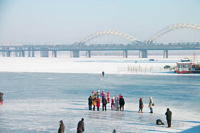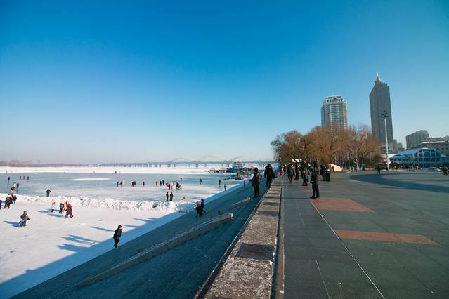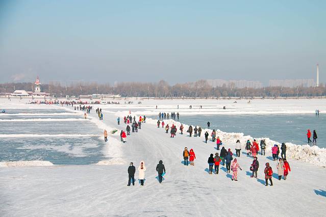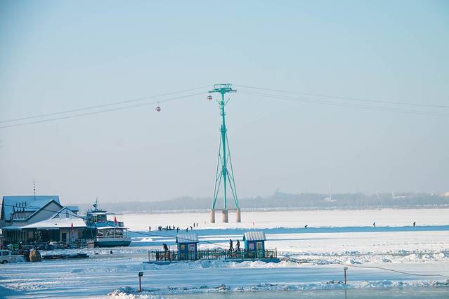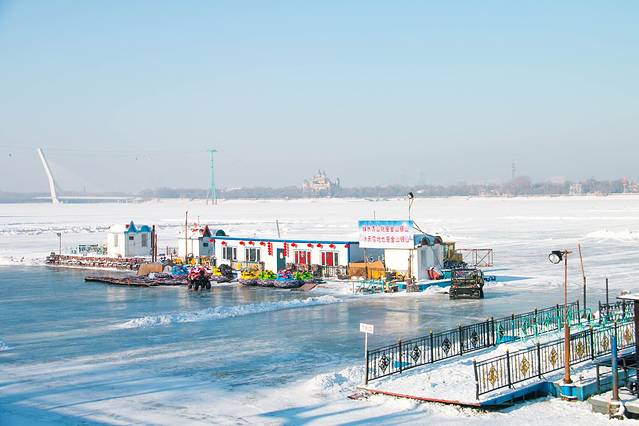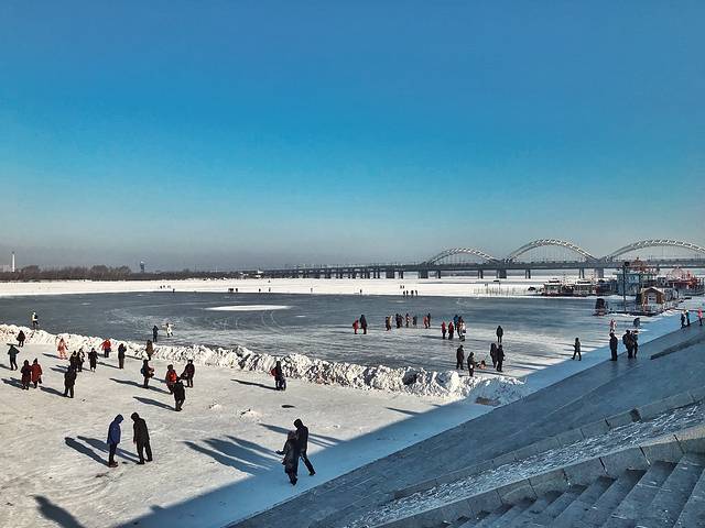 往江畔走去便是哈尔滨的母亲河松花江,冬季的松花江早已冻成厚厚的冰,成为城市中央的游乐场,许多冰上项目都在这里可以体验到,人们在这里尽情用自己喜爱的方式与冬天碰撞出火花。