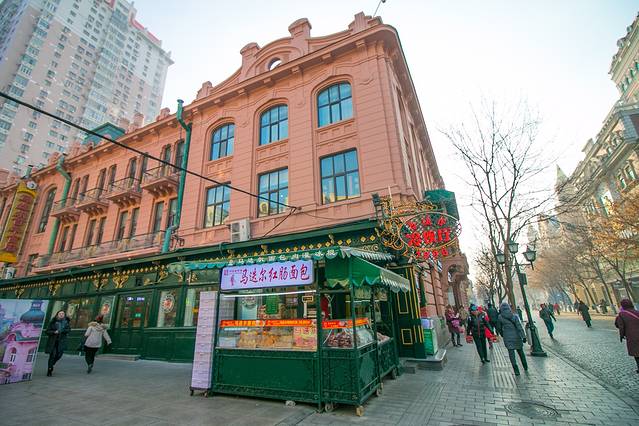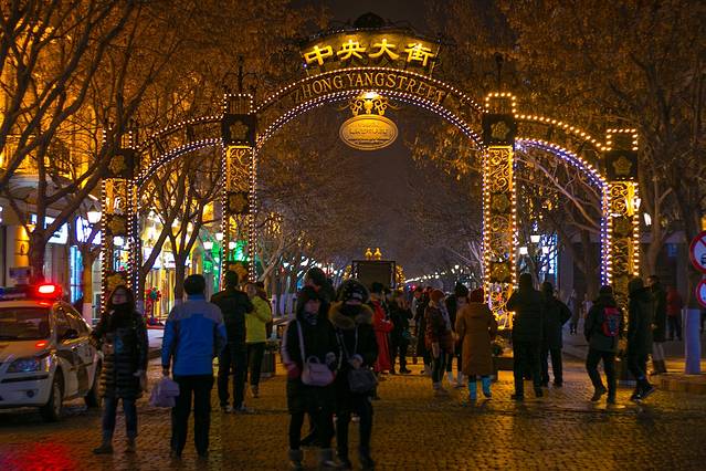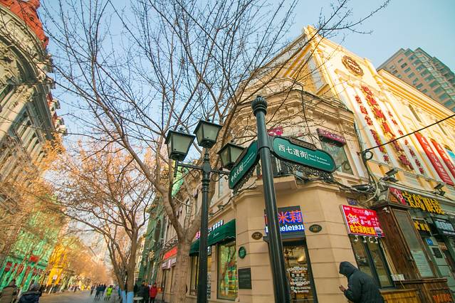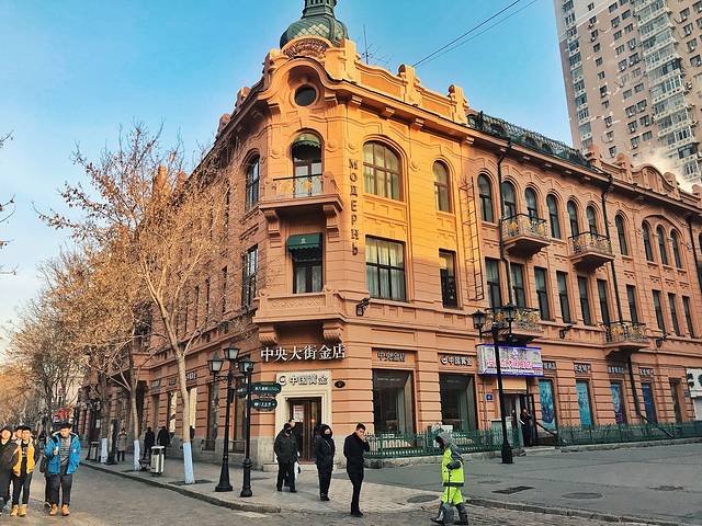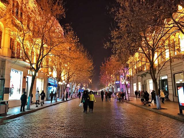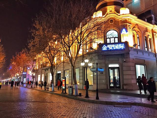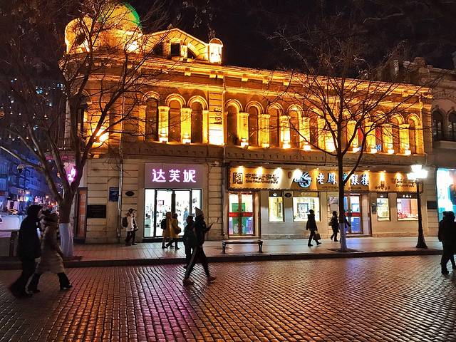 随着教堂正门的另一端笔直走去,几分钟步行的距离,便到了哈市另一处代表性的打卡地-中央大街,数百米的街道两旁商铺栉比鳞次、灯火跳跃,行走在两旁皆是巴洛克建筑的中央大街上,恍惚间以为自己身处欧洲街头,也许是圣诞的来临,这里早已充满了节日的气氛,凹凸不平的铺满方形砖块的街道,旧的也有了岁月的味道,仿佛能幻想到早期这个卸货场马驮货物经过的繁忙景象。