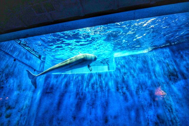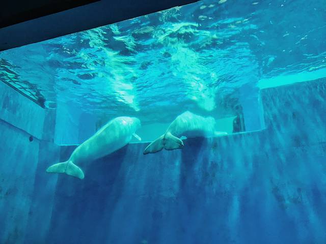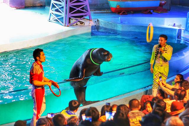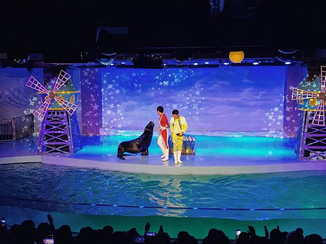 有两个必看的就是海狮表演和白鲸表演,极地白鲸水下表演—海洋之心,这也是世界唯一极地白鲸水下表演,两个驯养师和两只白鲸共同水下完成,背景音乐是泰坦尼克号的my heart will go on,加上非常棒的水下灯光效果,真的像是演绎了一段人与白鲸的爱情故事,听漂亮的解说妹子说他们已经接受过国内外的专访数十次了,果然已经是明星待遇了。