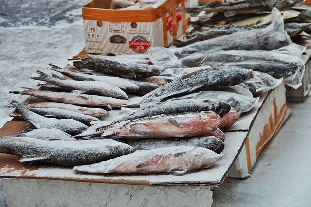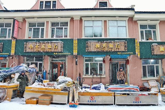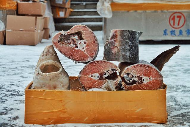 初到这座城市,发现满大街都是各种鱼餐馆,在面馆吃面的时候从店老板那里得知原来抚远可是大马哈鱼和中华鲟的故乡,这两种鱼类都是黑龙江特有的品种,现在也是越来越珍贵,每年只有5月初到6月10号和9月初到10月初才可以捕鱼,既然有很多鱼餐馆,这个地方少不了应该有鱼市,果真老板告诉我东极鱼市是当地最大的鱼市,并且很热情的带我指路告诉我怎么走,那就将东极鱼市作为第二天早上去的地方吧