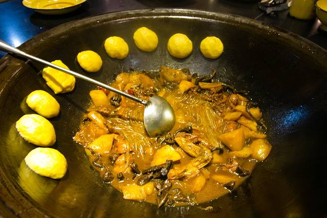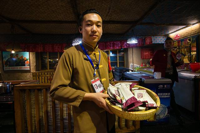 “大舅,大舅妈,二位里边请” 好家伙,刚进门都被这样称呼,吓我一跳,原来这是对来这里的顾客统一的称呼,服务员的名字都是二虎子,狗蛋儿,丫蛋儿。这里的服务员嘴巴真甜,不停的爱跟你唠嗑,把你哄开心了,看见没,脖子上的二维码就可以分分钟赏钱了,每天晚上7点有二人转表演,就这样坐炕上吃着炖锅,听二人转,哎妈呀,老接底气儿了,来哈尔滨必吃的一家特色店。