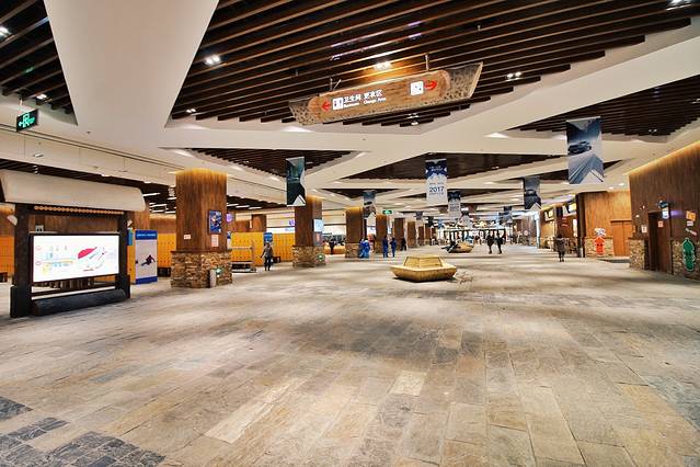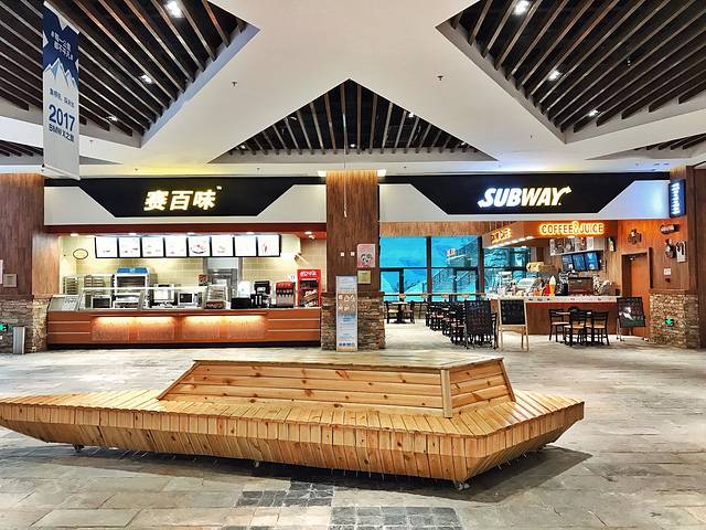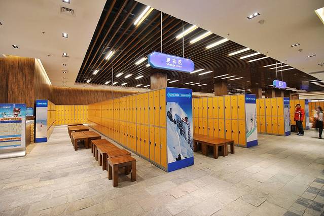 买了票,取了卡,就可以进去换装,取手杖、雪板、头盔,向雪道出发了,大厅非常的宽敞明亮,有一些快餐店也是贴心啊,在这项超费体力的运动后,来这里补充下能量也是不错的嘛,初级雪道和中高级雪道的入口是分别开的,一层为初级,二层则是中高级,中高级滑道的滑雪者可以不用在一层换取装备,二层也设有柜台,非常方便。