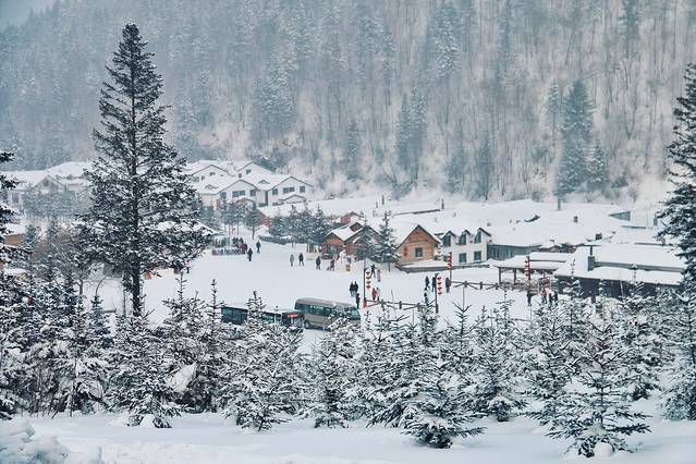 当汽车翻山越岭,穿越在满山雪松的峡谷间,以为自己是在踏上雪国的列车上,而河流上一棵树枝顶着的一小坨一小坨的蘑菇,提醒我雪乡就在前方不远处,望着雪峰,看着飘雪的窗外,就这样闯入这片雪色中的世外桃源,不知今晚是否会遇到我期待中的夕阳。