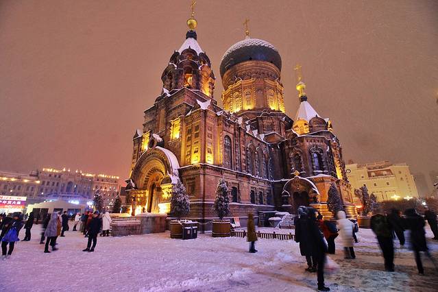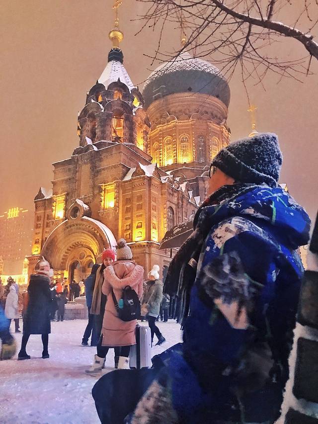 每次到访哈市,我都将第一站留给那座最独具特色、充满浓郁异域风情的圣索菲亚教堂,它已经成为哈市一道最具特色的风景线,也是来到哈市的每位必去打卡的地方,无疑这里只有在下雪的冬季这里才是最有魅力的,这次也不例外,恰逢一场突如其来的大雪天,广场很快就被人海所填满,人们早已忘记了寒冷,一张张开心的脸庞和一对对身影很快填满了这里,瞬间变成一片欢乐的海洋。