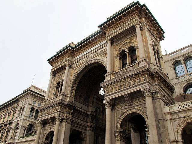 巨大的廊顶呈拱形,装饰着彩色玻璃棚,地面是用大理石铺成的马赛克图案。整个拱形建筑富丽堂皇,既时尚又浪漫。