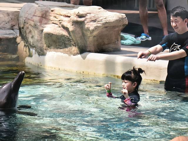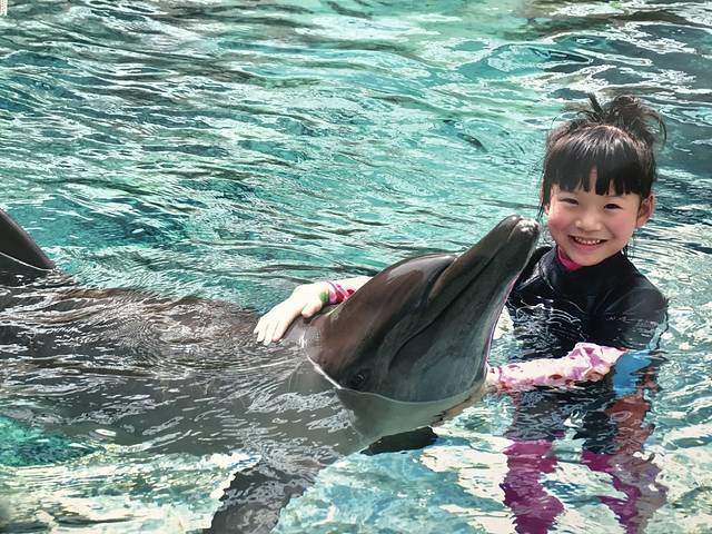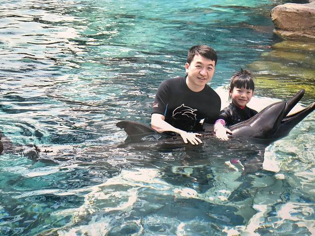 本次旅行小妞最喜欢的项目就是和海豚互动,我也是在乐派网上早早预定好的,这个要提前预约时间,每天好像就几个时间段,而且限定人数,临时约的话估计排不上。