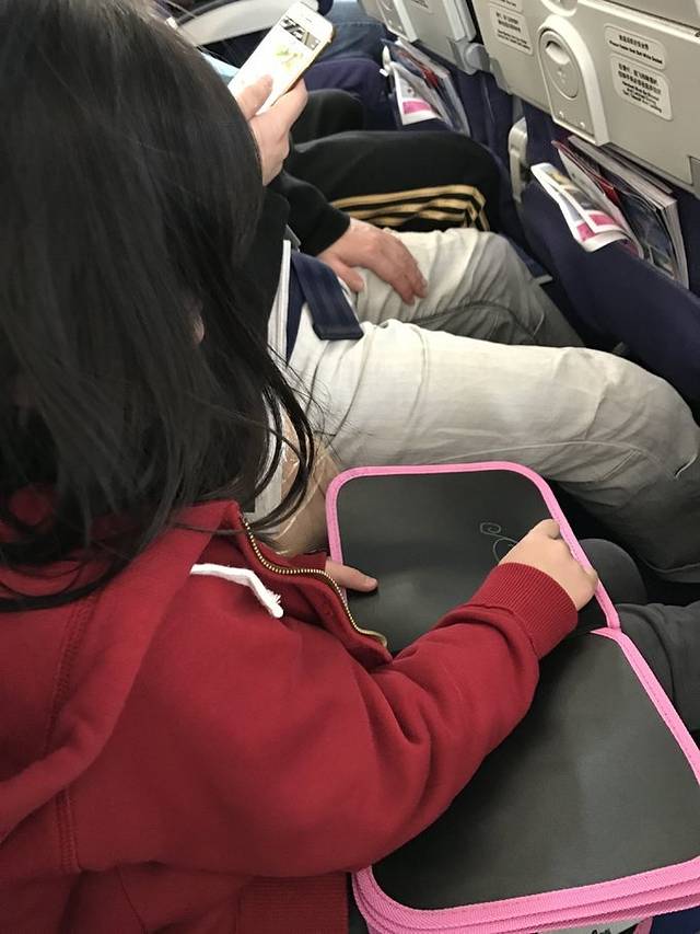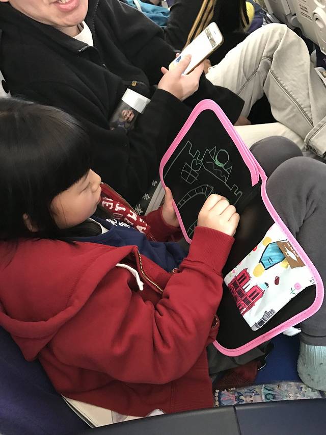 最近我找到一个神器,可擦写的画板,还有小袋袋可以收纳粉笔,爱画画的小朋友可以在飞机上玩很久,画完写完用湿毛巾一擦就又能用了,非常好用。