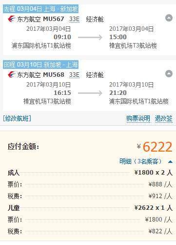 往返含税只要1800一个人,不过小孩子倒是要比成人还要贵,而且不能以成人的价格来购买。往返新加坡这个航班时间应该算是很完美了,到达当天就可以逛起来,回程的时候又有足够的时间在著名的樟宜机场玩玩玩买买买,三个人加起来才6k多,真是笑不动了