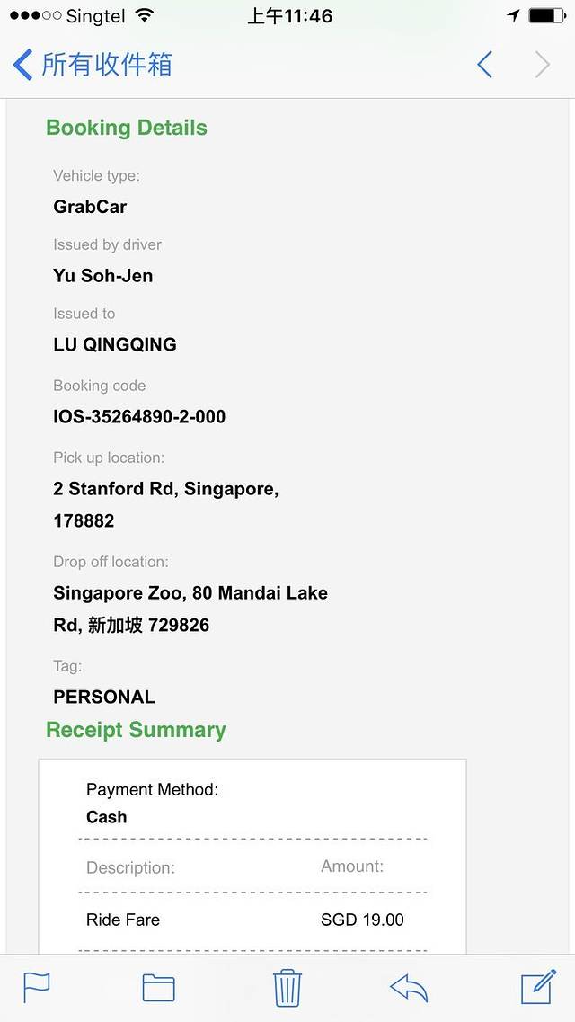 市中心去动物园距离不短,公交车还需要换乘,单程路程时间大概要将近两个小时,出租车大概20新币,折合人民币100左右,开过去也就半小时,我就入乡随俗下了个grab叫了辆车过去,grab相当于这边的滴滴,车辆还是比较好叫的,而且还可以用现金,使用感受还不错