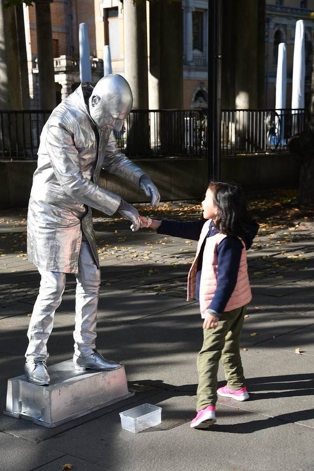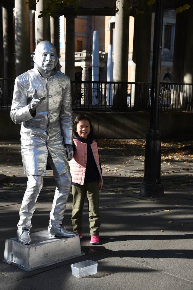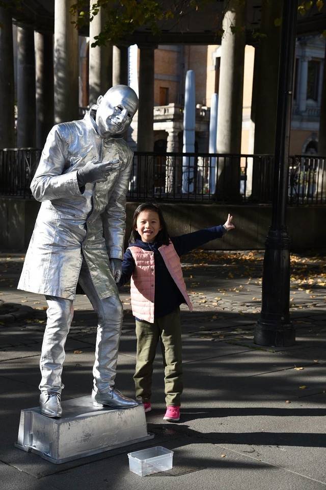 奥斯陆街头还会有街头艺人表演,很专业呢,小妞鼓起勇气上前跟那位爷爷互动,超有爱的样子