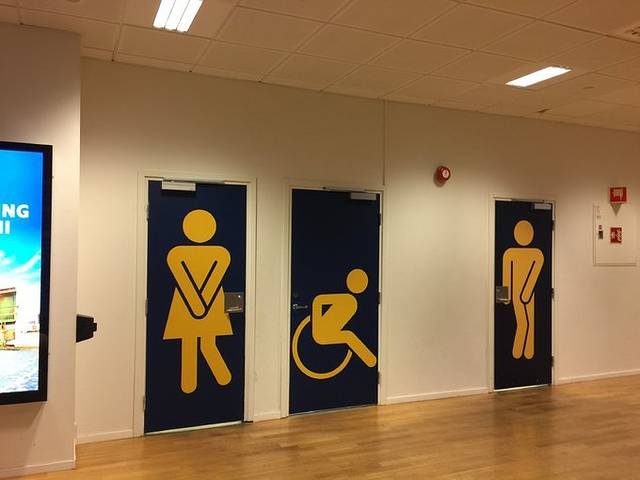 由于第二程飞机机械故障,晚点了一个半小时,到达卑尔根已经很晚了,卑尔根机场的厕所标示很有趣。和奥斯陆相比,有一种平民化的轻快风。根据旅行专家同学事先帮我查好的路线,我们很顺利得在机场门口找到了机场快线的巴士,买票直接上车问司机买就行了,往返更便宜些,小孩子免票,我们的酒店就在最后一站,方便极了。