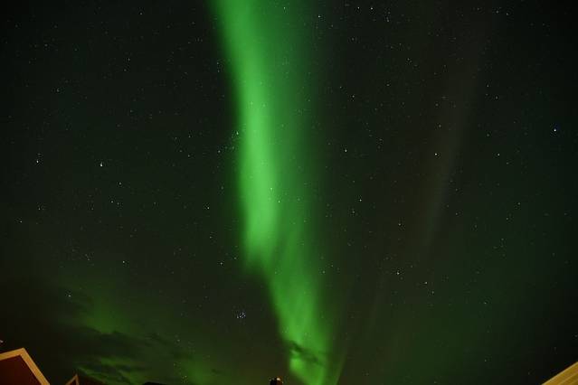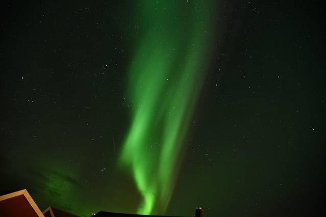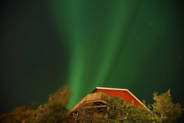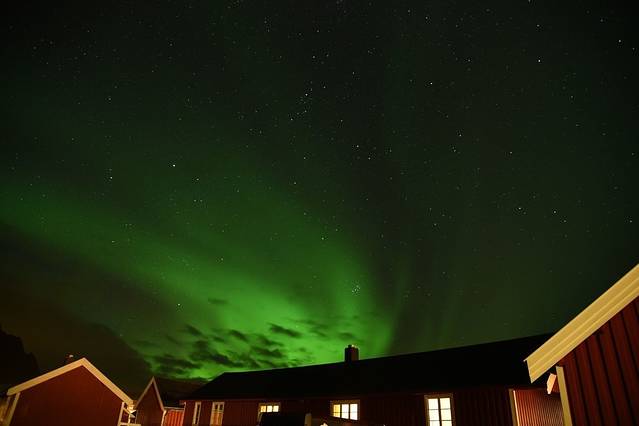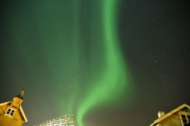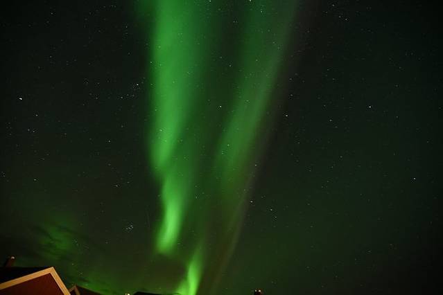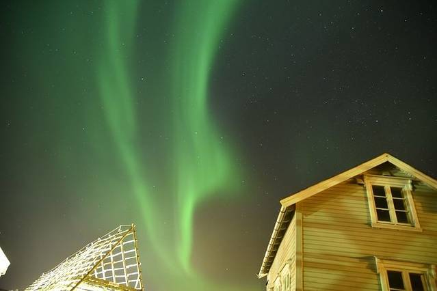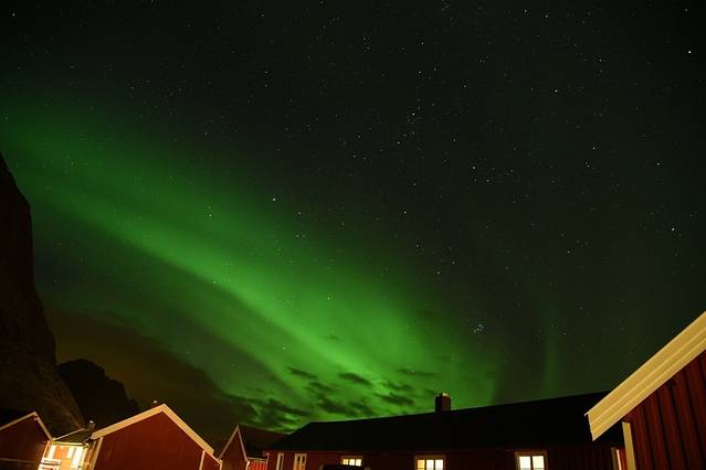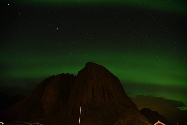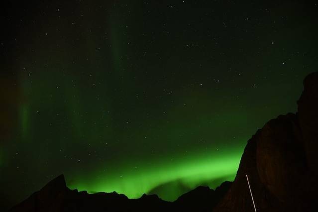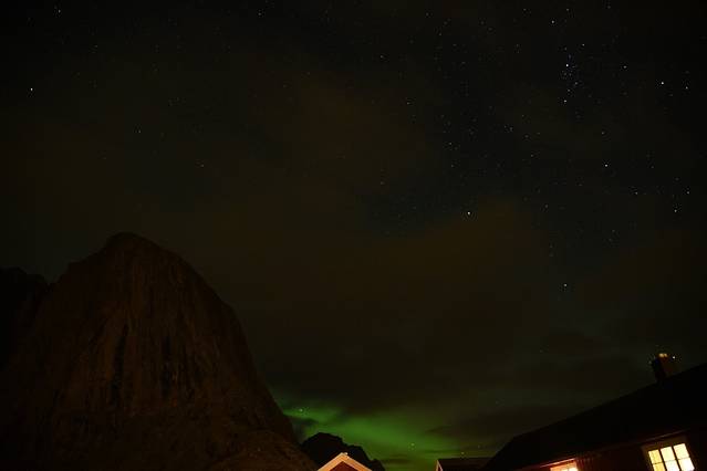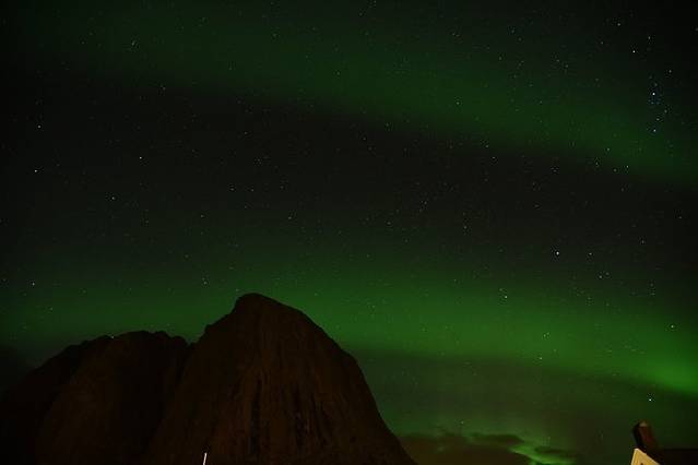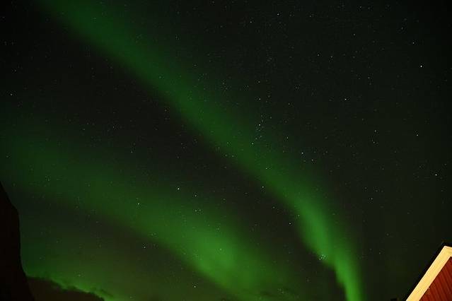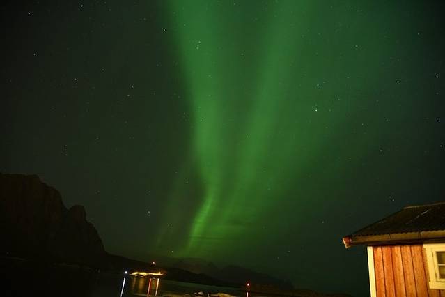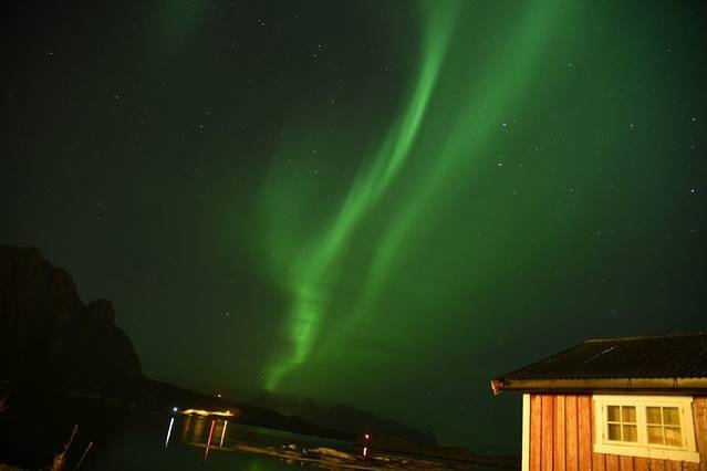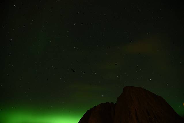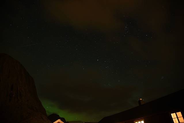 人品开挂如我们,到达罗弗顿之后天气越来越好,入夜后星空像缀满钻石的黑丝绒布,根据前一晚的经验九点左右我们架起三脚架到小木屋后面的空地上,等了没多久,欧若拉女神就悄悄降临了,一开始还只是轻轻舞动,慢慢绿光弥漫了正片天空,后面幻化成三道极光一起舞动,真是美仑美奂