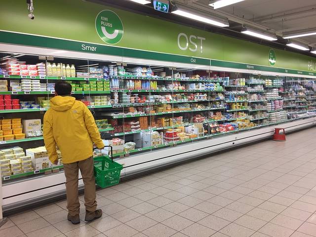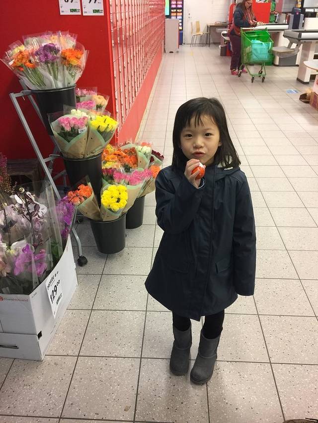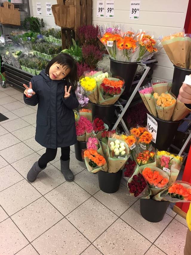 安顿好行李,小木屋里有全套厨房设施,我们就开车出去采购晚餐的食材,酒店过桥就是斯沃尔维尔小镇,镇上有三家超市,Avis的大叔告诉我说这家kiwi最便宜,而且停车免费,其他的超市停车凭购物小票申请免费,他们自己去kiwi比较多,所以我们就选这家。超市里生鲜食品一应俱全,我还发现了毛线和各种编织工具,编织书,太让我兴奋了我还发现只要有卖东西的地方都有卖花的铺子,事实证明北欧的生活真的是很闲适,大家都会比较在意生活的细微美好而不会太在意表面的浮夸