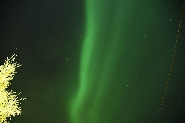 根据前两晚的经验,晚上八点我们到小木屋后面来看看极光有没有出来,但是等了好久只有后山一点点浮现