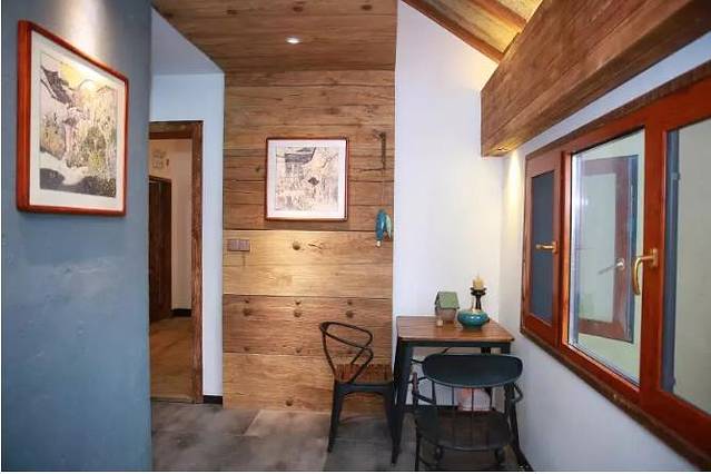 走进民宿的内部,是以暖黄色灯光为主的的温馨氛围,墙体以原木风与蓝色背景为主,颇有一种美式乡村田园风情。