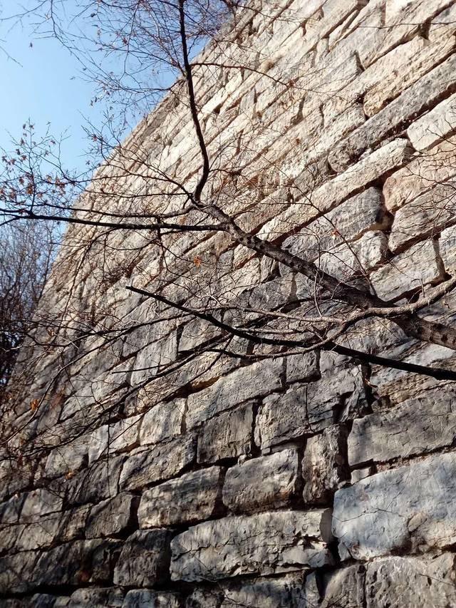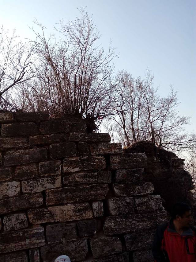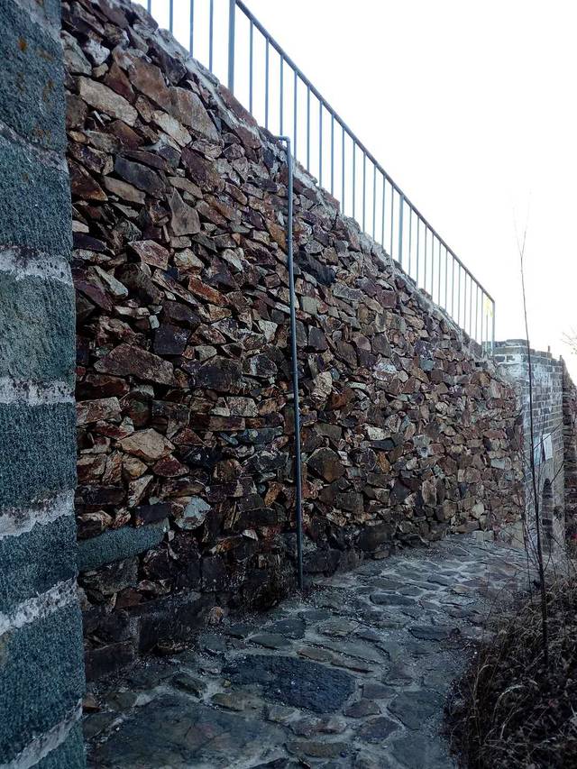 此处是九眼楼长城前段,身后500米处是九眼楼炮台。很明亮整齐,是去年人工修缮好的。这没有砖台,没有垛口,只是石头,坡起坡落