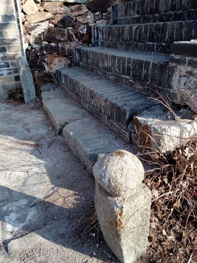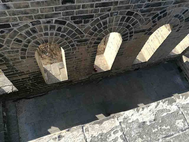 看九眼楼的眼和门,修缮过,颜色不同。回复了原貌,也结实了很多,更加保护好古迹,不被 大自然磨损。拾级而下,是拴马桩,到过道楼。