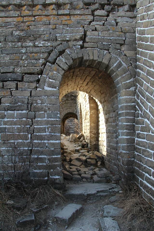 下台阶,就是过道楼,也是九眼楼的外墙根基。过道内,有九眼楼标牌,碑文,古树池;过道外,出敌楼,离开九眼楼,远去。