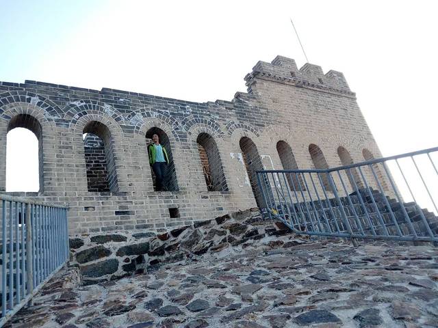 转过身,迎着朝霞,就是著名的九眼楼。旁边有个附属敌楼,脚下面,还有个过楼洞。