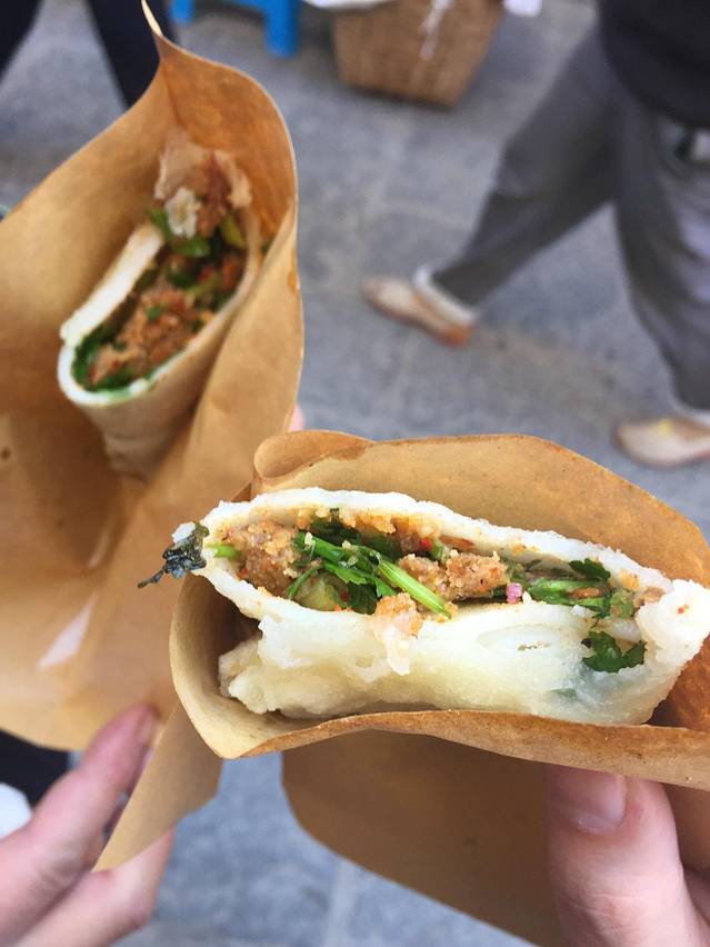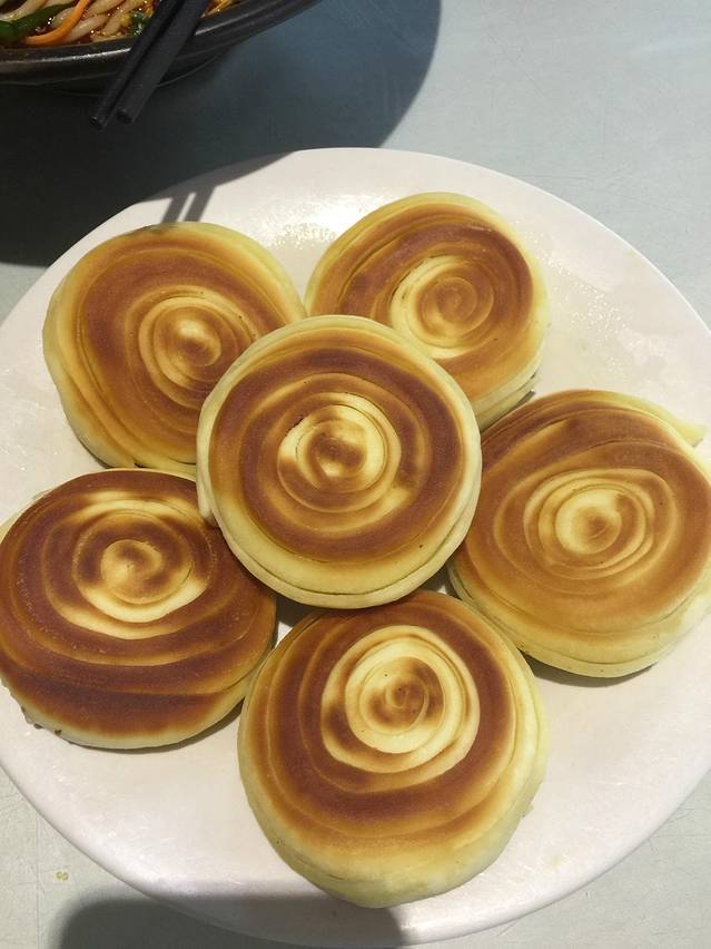 街中心有很多家喜洲粑粑 甜的和咸的 可以买一个一起尝尝 我们买了一个咸的 中国披萨 味道还是不错的 新出锅热热的 我们就在街边吃了