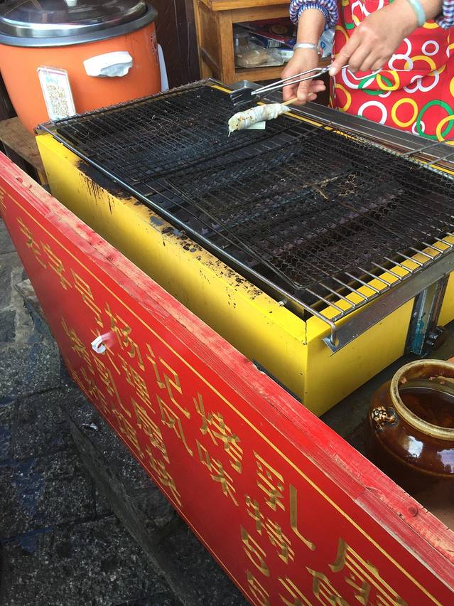 这也是古镇特色 10元一个 正常是切成两份 我的强烈要求 给我们切成了三份 哈哈 吃过之后 中午饱了 里面是肉和当地的一种调料 还有香菜 不喜欢香菜者慎入