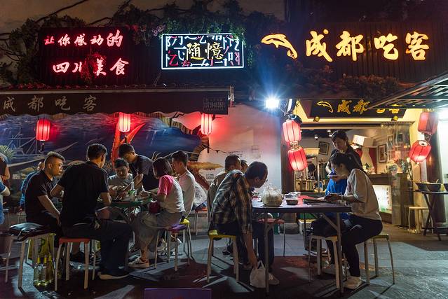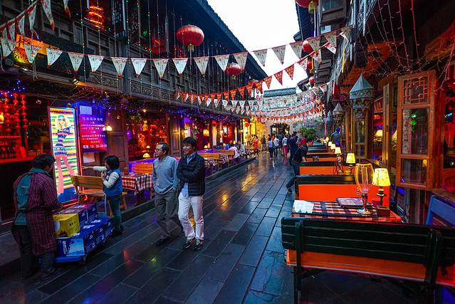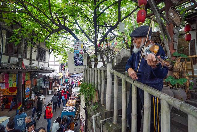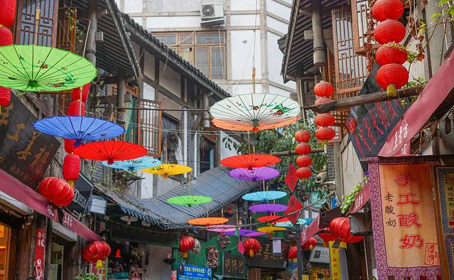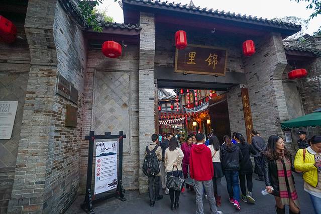 锦里洋溢着成都市井特有的喧嚣和随意。街道两边售卖的都是颇具当地特色的物品,手工的皮包、五颜六色的布灯笼等,还有众多老成都手艺人在忙碌,吹糖画、捏面人。此外,各色美食绝对令你垂涎三尺,张飞牛肉、豆花、钵钵鸡,各具风味。