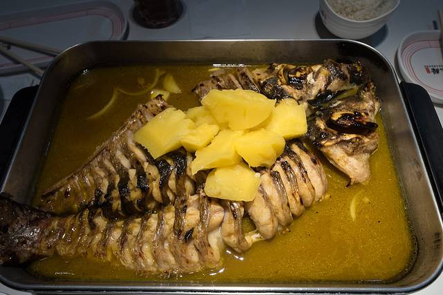 而一个是小火煨出的烤鱼片,细嫩鲜美,上面还有菠萝带来的清爽。
