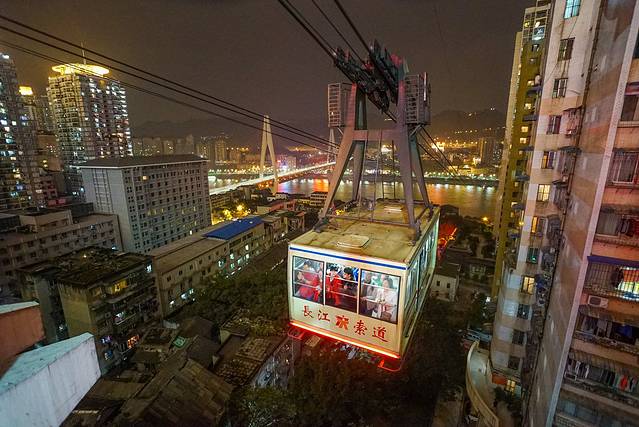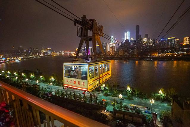 “不览夜景,未到重庆”,乘坐全程约千米的长江索道,是近距离俯看重庆夜景的绝佳体验。