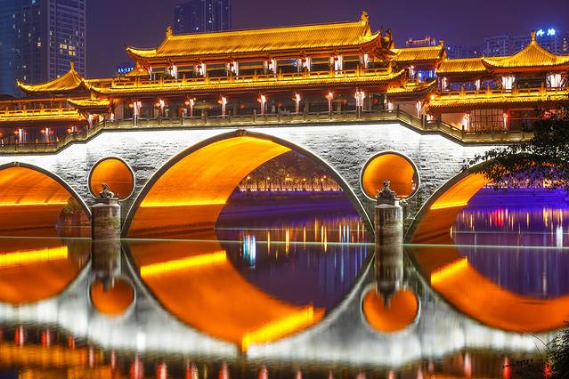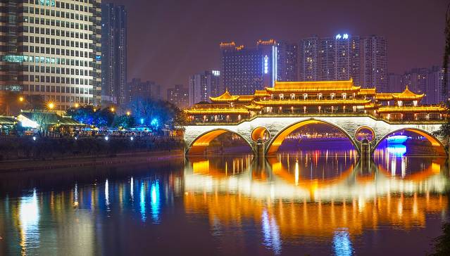 【九眼桥】,位于四川音乐学院附近,是成都著名的酒吧一条街,古典风格的廊桥很漂亮,桥的建成年代现在已经无从考证。九眼桥周边有大量的酒吧、餐厅、茶馆等娱乐场所,晚上非常的热闹,充斥着前来泡吧的游人。夜晚的九眼桥,在灯光的衬托下,更加的炫目。