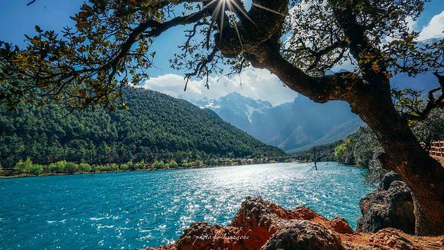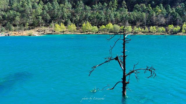 这颗枯树人来人往没人注意,但是我感觉她在这里点缀了蓝月谷