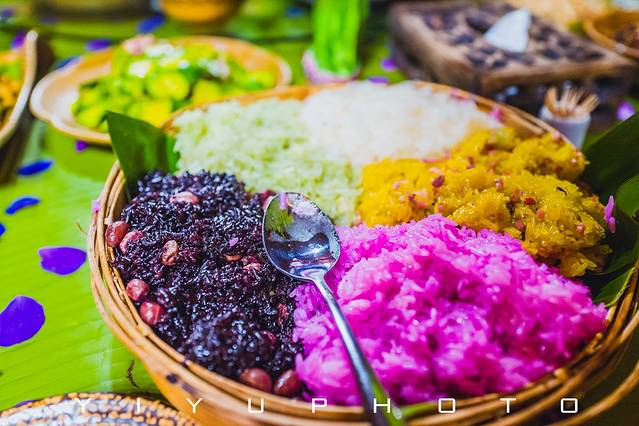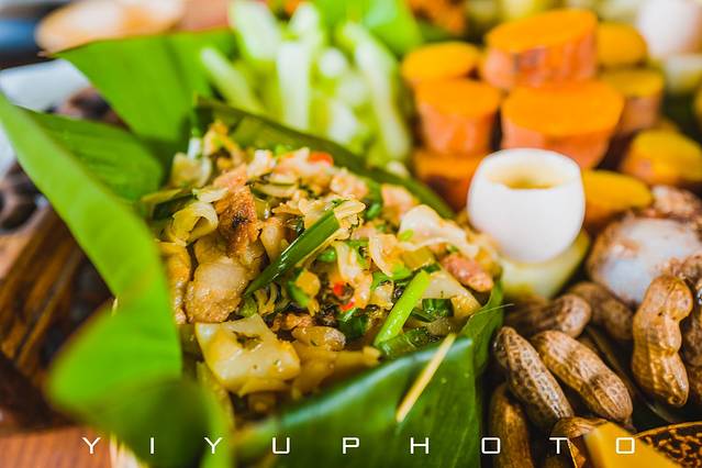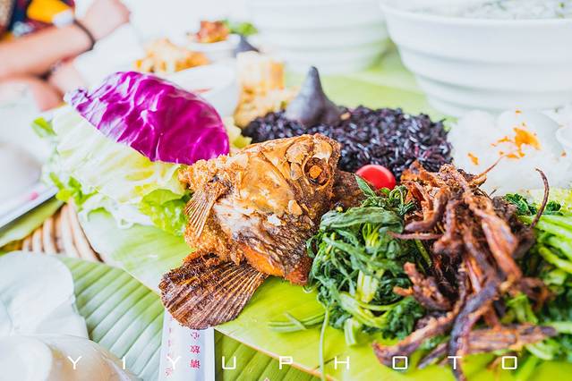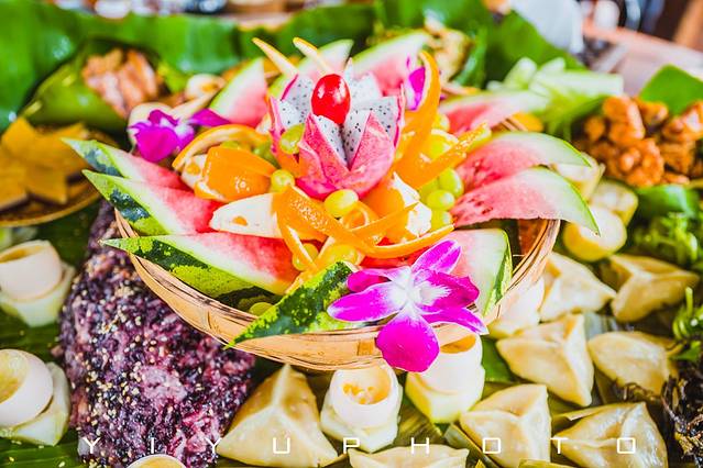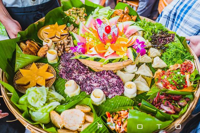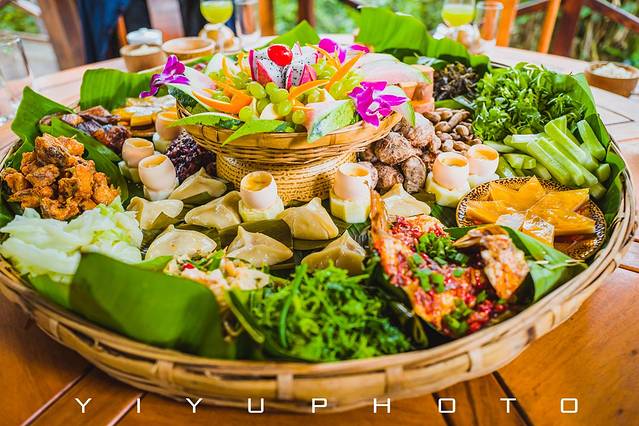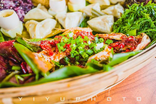 三宝宴满满一个圈,需要两三个服务员抬着上来,拍照也是需要举的高高的才能拍全,中间是新鲜的水果,各种有营养的杂米饭,紫米饭,当地有特色的主食,外圈一周是各种野菜、烤肉。炒菜,见过没见过的食材在一起,鲜香味美,太丰盛啦!